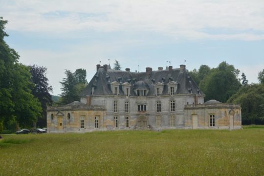 Bei 35 Grad Hitze bietet uns der Schlosspark von Acquigny Erholung am Wasser und auf Gartenbänkchen im Schatten uralter Bäume.
