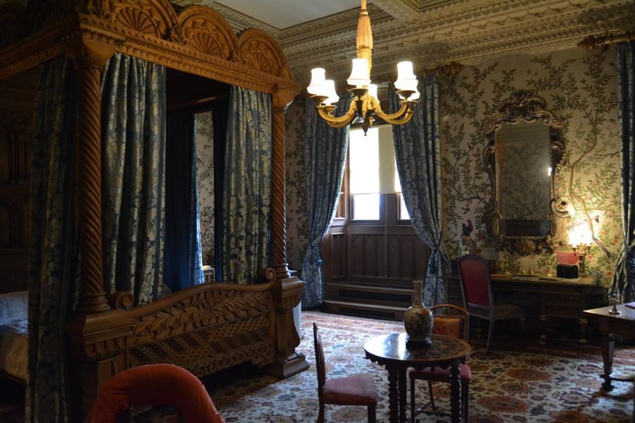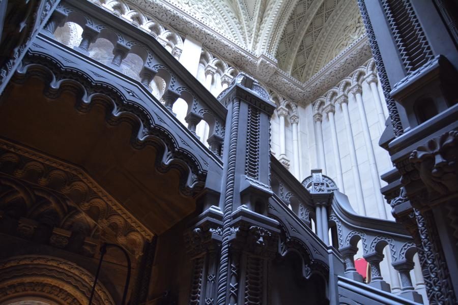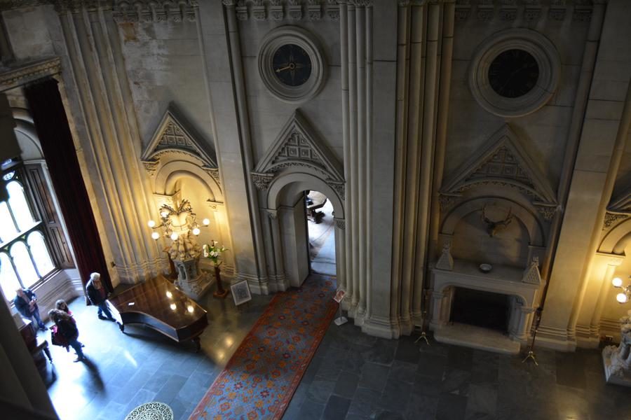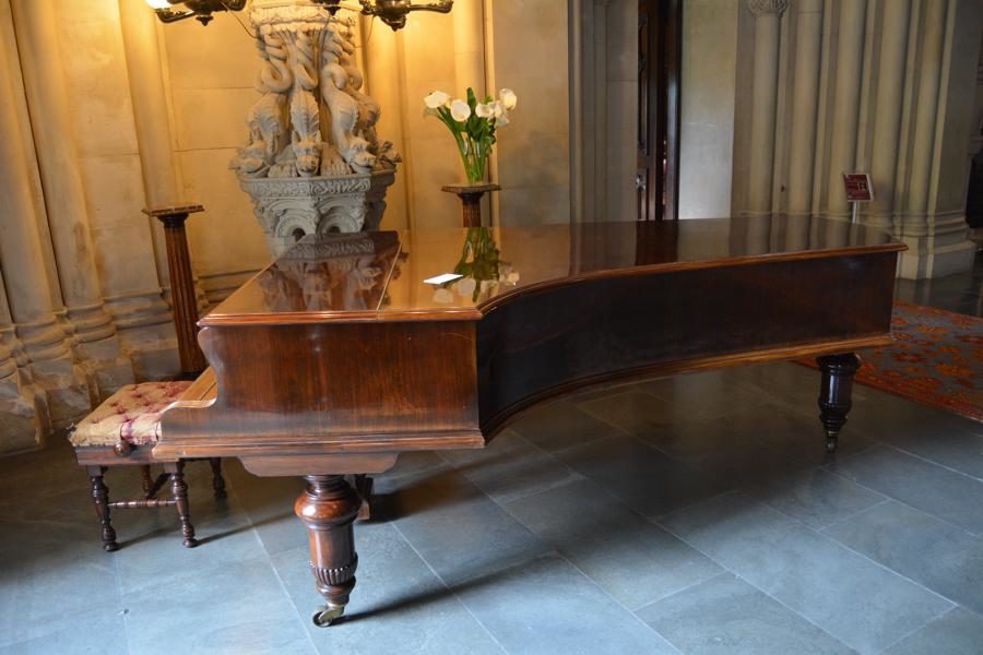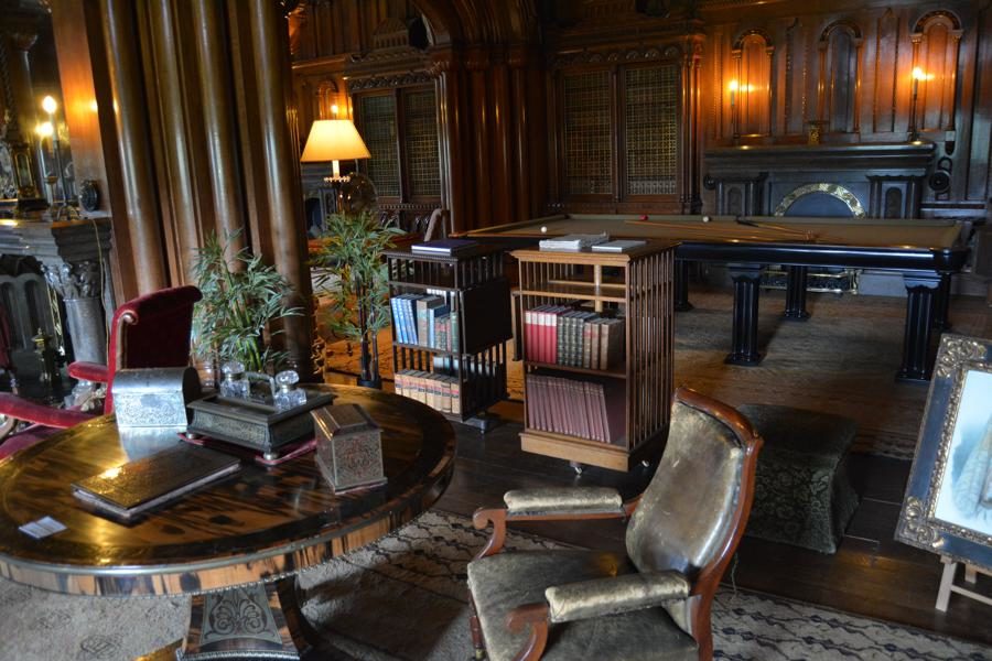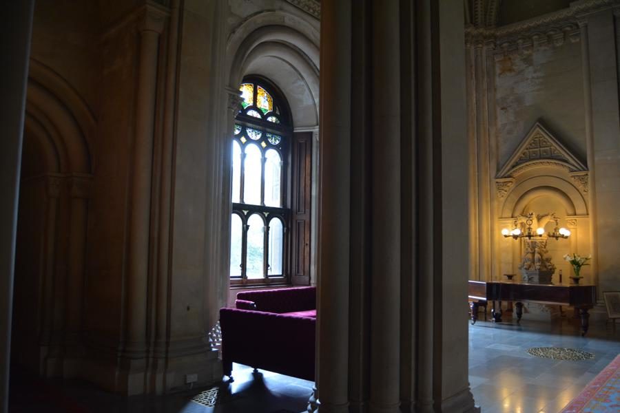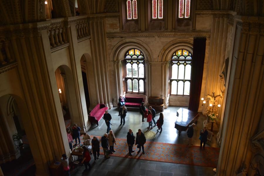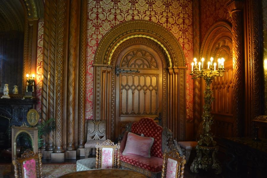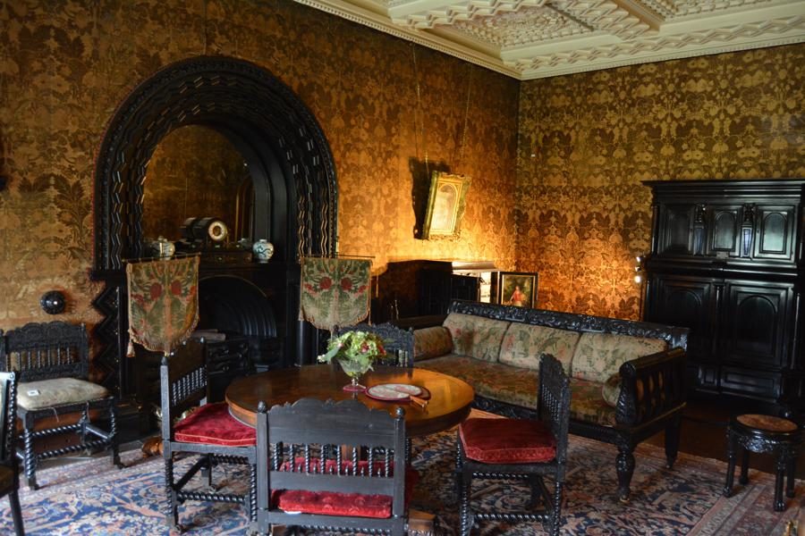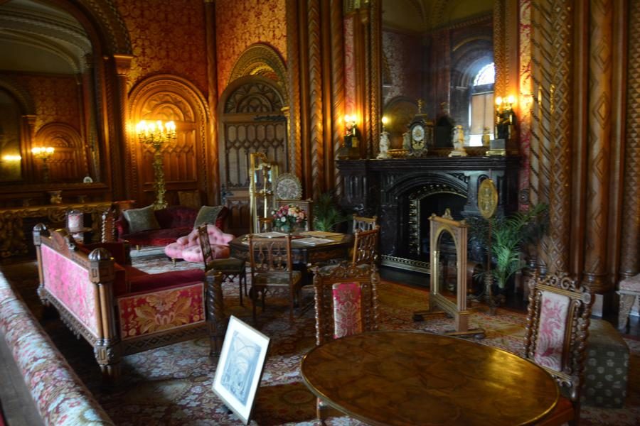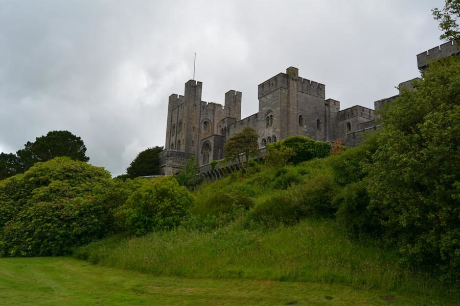Penrhyn Castle wurde 1837 im neonormannischen Stil von einer reichen Industriellenfamilie erbaut und ist nach Windsor Castle das zweitgrösste Schlossgebäude Grossbritanniens. Das Schloss ist von monumentalen Ausmassen, mit überbordenden Stukkaturen dekoriert und in den Wohnräumen dank möglichst kleinen Fenstern in Kombination mit möglichst dunklen Möbeln deprimierend düster. Alles in allem aus unserer Sicht ein geschmacklicher Albtraum…