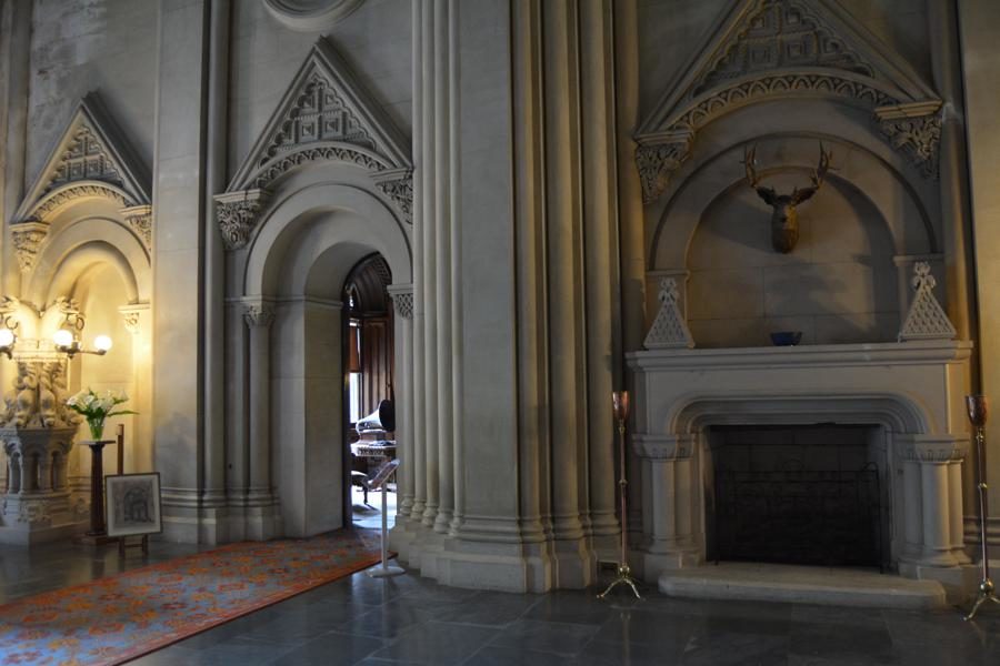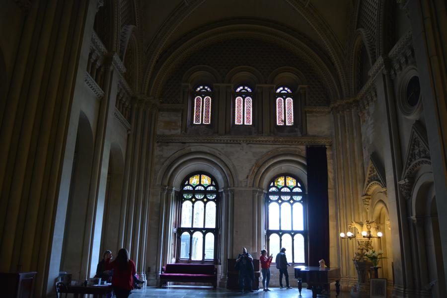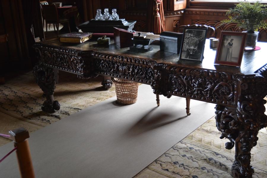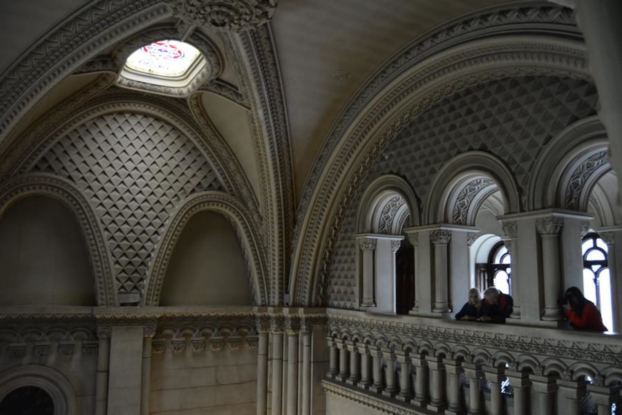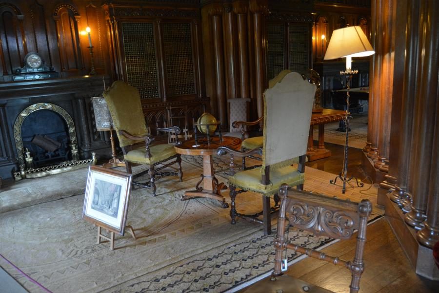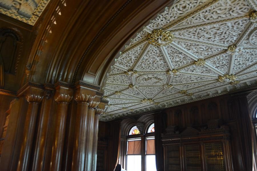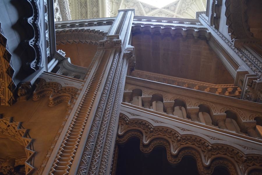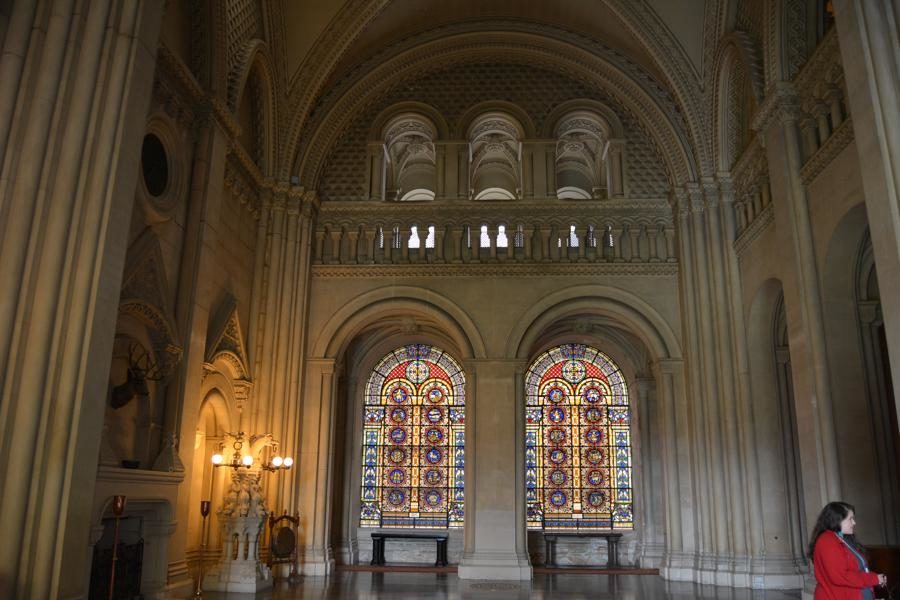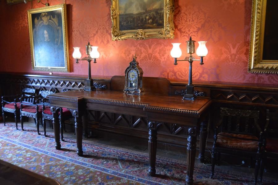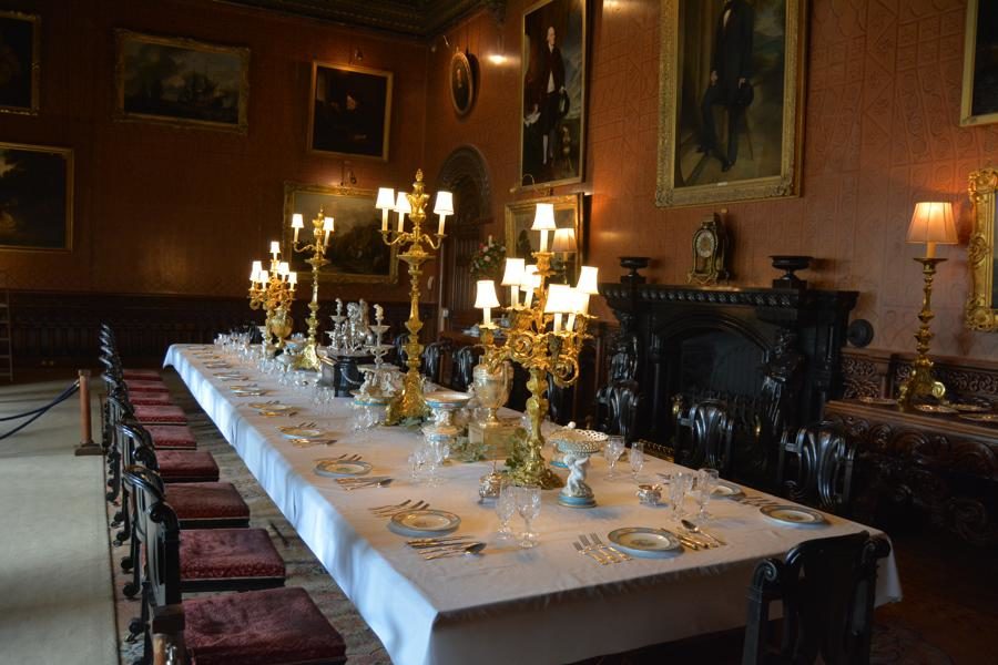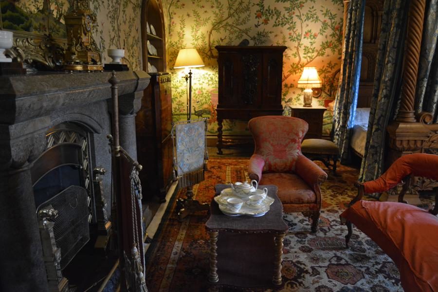 Penrhyn Castle wurde 1837 im neonormannischen Stil von einer reichen Industriellenfamilie erbaut und ist nach Windsor Castle das zweitgrösste Schlossgebäude Grossbritanniens. Das Schloss ist von monumentalen Ausmassen, mit überbordenden Stukkaturen dekoriert und in den Wohnräumen dank möglichst kleinen Fenstern in Kombination mit möglichst dunklen Möbeln deprimierend düster. Alles in allem aus unserer Sicht ein geschmacklicher Albtraum…