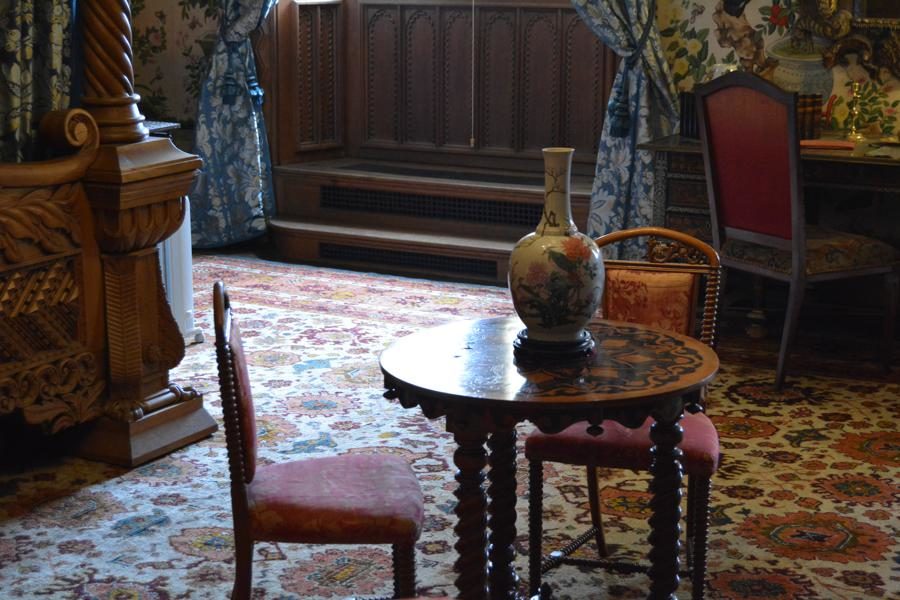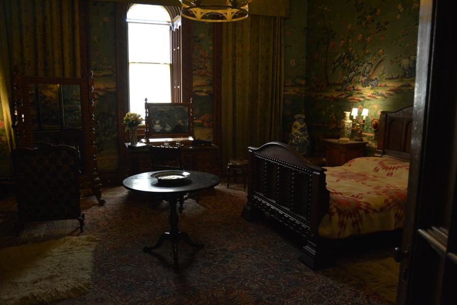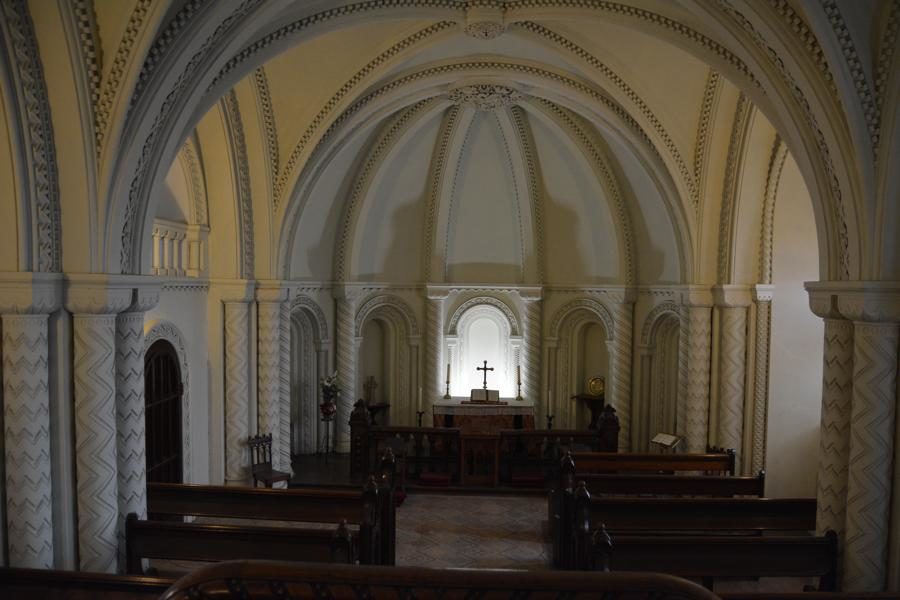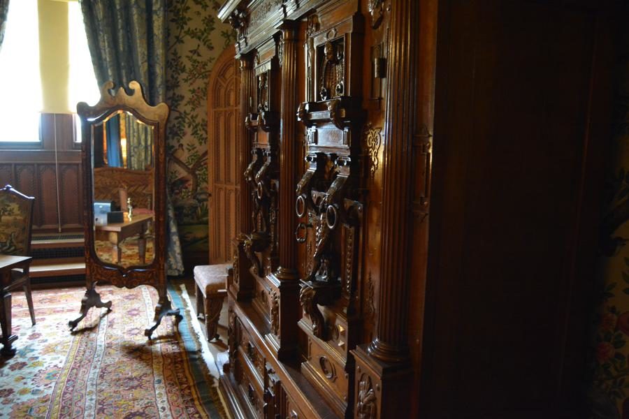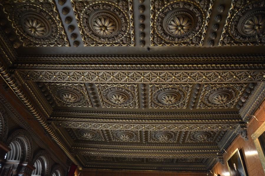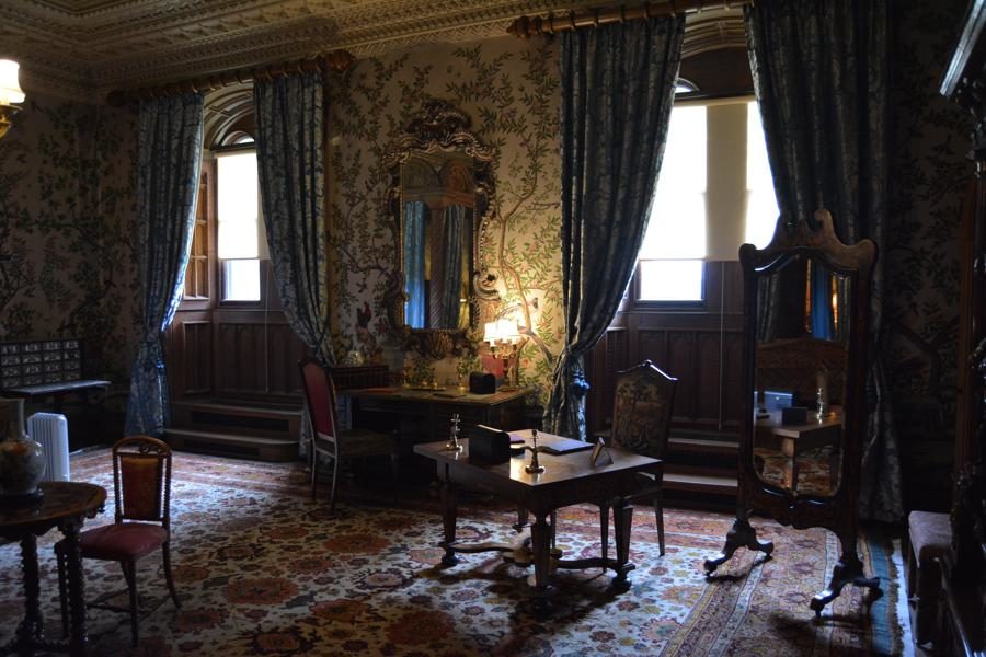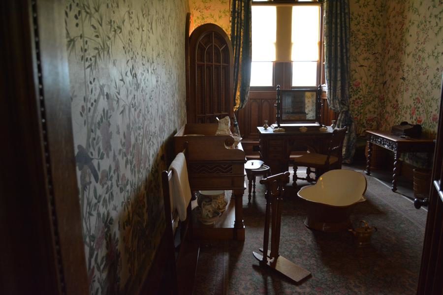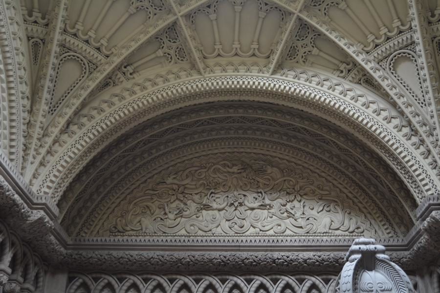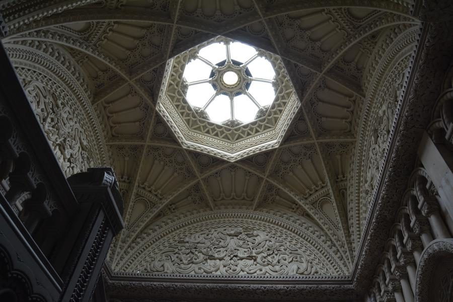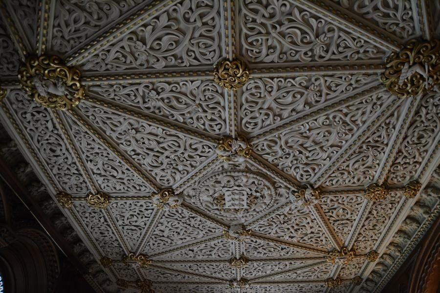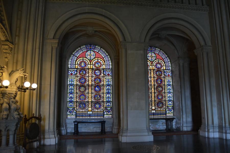 Penrhyn Castle wurde 1837 im neonormannischen Stil von einer reichen Industriellenfamilie erbaut und ist nach Windsor Castle das zweitgrösste Schlossgebäude Grossbritanniens. Das Schloss ist von monumentalen Ausmassen, mit überbordenden Stukkaturen dekoriert und in den Wohnräumen dank möglichst kleinen Fenstern in Kombination mit möglichst dunklen Möbeln deprimierend düster. Alles in allem aus unserer Sicht ein geschmacklicher Albtraum…
