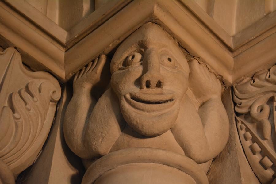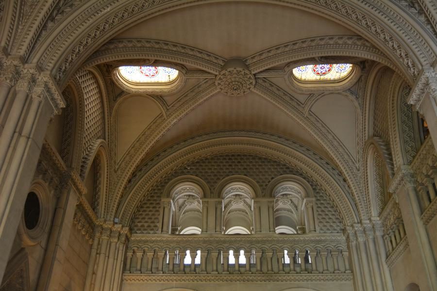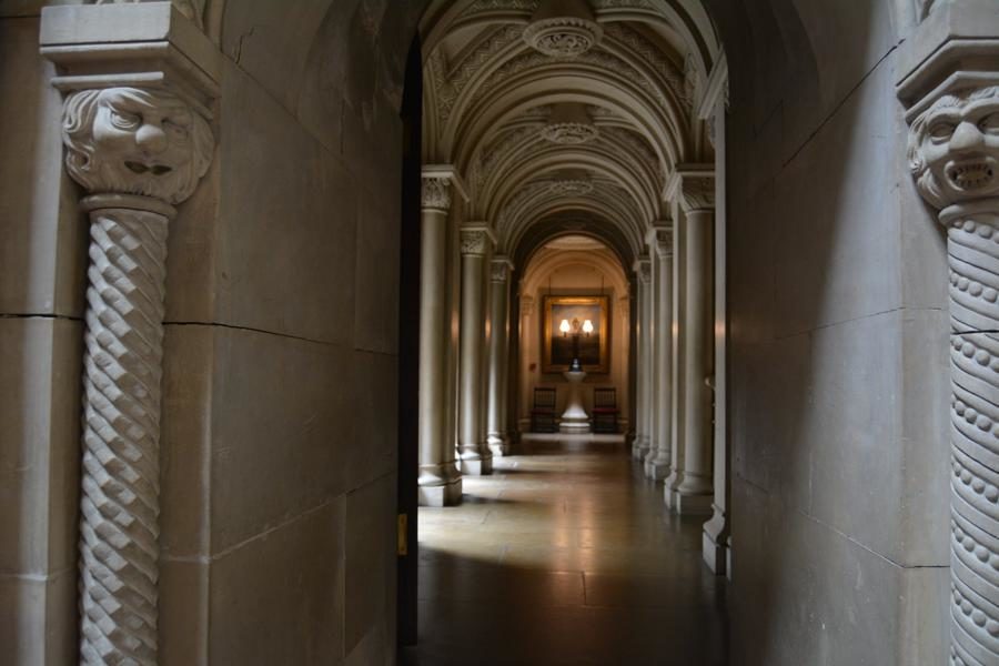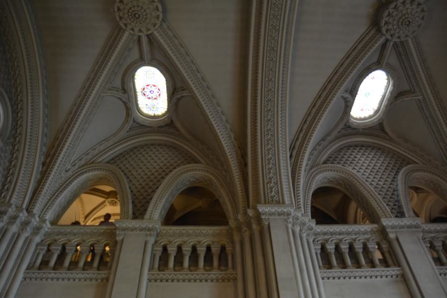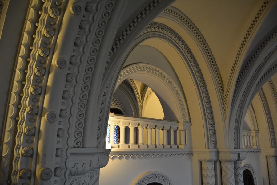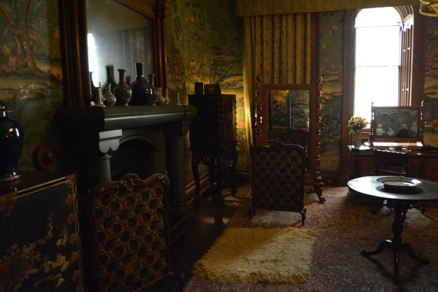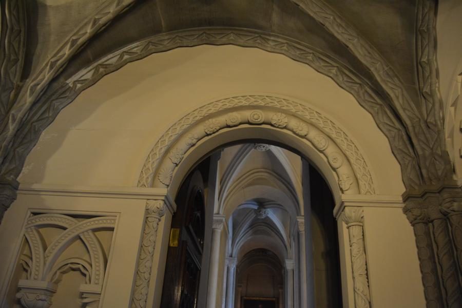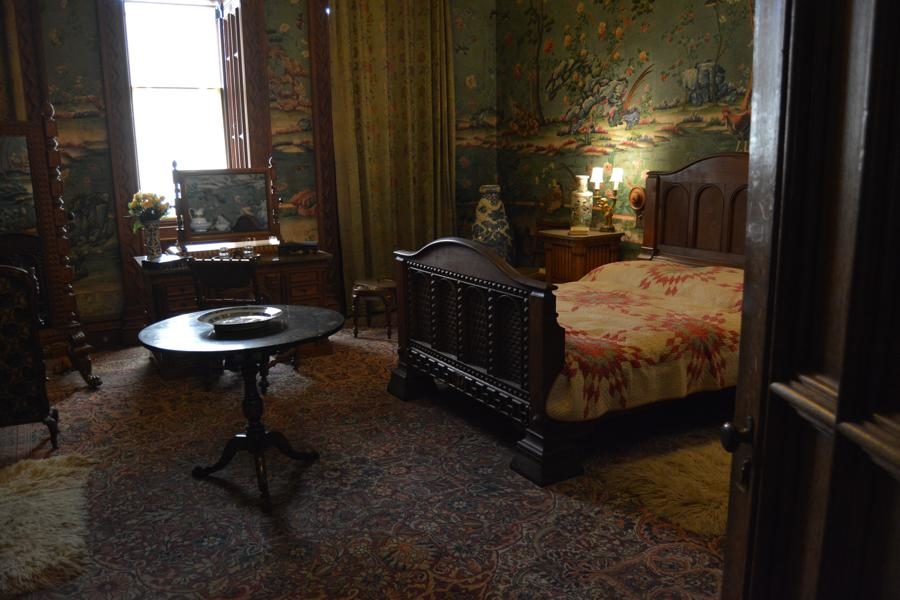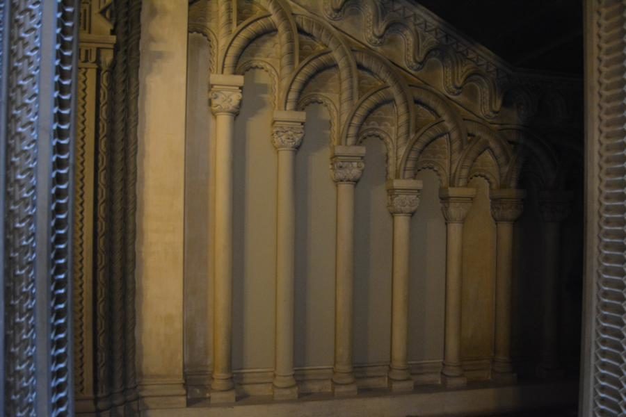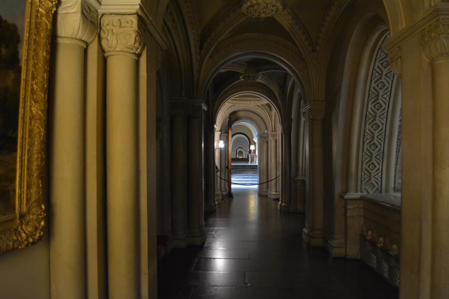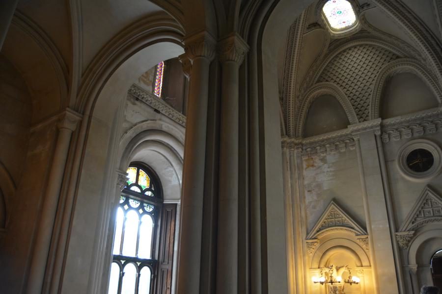 Penrhyn Castle wurde 1837 im neonormannischen Stil von einer reichen Industriellenfamilie erbaut und ist nach Windsor Castle das zweitgrösste Schlossgebäude Grossbritanniens. Das Schloss ist von monumentalen Ausmassen, mit überbordenden Stukkaturen dekoriert und in den Wohnräumen dank möglichst kleinen Fenstern in Kombination mit möglichst dunklen Möbeln deprimierend düster. Alles in allem aus unserer Sicht ein geschmacklicher Albtraum…